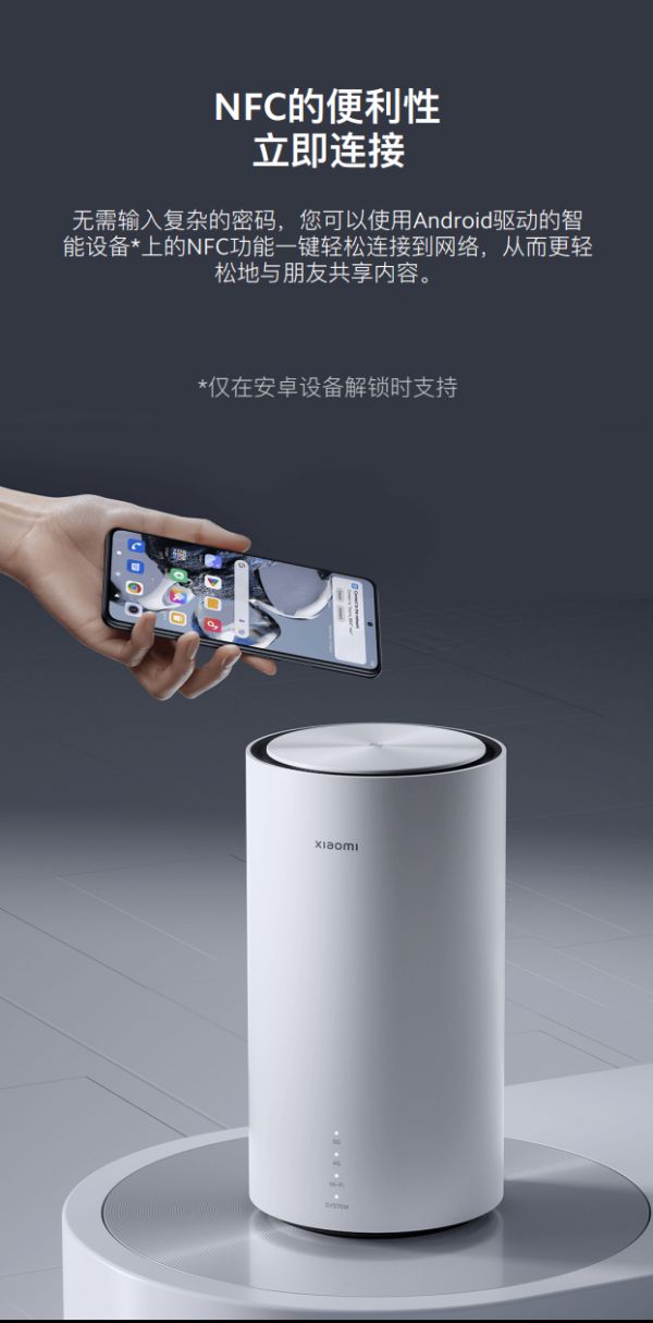 此外,它还可以通过 NFC 一键连接到无线网网络,支持 MIUI 智能⼿机的独家游戏加速,可识别您的⼩⽶ / Redmi 智能⼿机,并在您玩游戏时启⽤特殊的加速隧道,以显著减少延迟和延迟。
