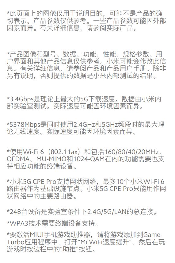 小⽶ 5G CPE Pro 可以将 4G / 5G 蜂窝⽹络信号转换为 Wi-Fi 信号,因此,即使您所在地区没有宽带可⽤,但只要有 4G / 5G 移动⽹络信号覆盖,就可以通过 Wi-Fi 稳定⾼速连接到互联⽹。