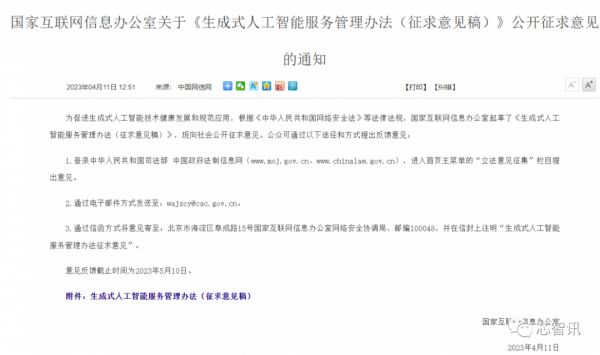 4月11日,国家互联网信息办公室(简称“网信办”)发布通知,就《生成式人工智能服务管理办法(征求意见稿)》(简称“《意见征求稿》”)向社会公开征求意见,意见反馈截止时间为5月10日。