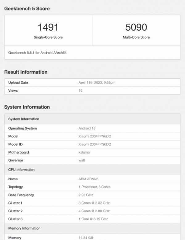 4月13日消息,小米的一款新机现身Geekbench 5跑分平台,型号为2304FPN6DC,预计该机为即将发布的小米13 Ultra。根据Geekbench平台的信息,小米13 Ultra的单核成绩为1491分,多核成绩为5090分,搭载骁龙8 Gen 2处理器,配备16GB运行内存,并且预装了最新的Android 13操作系统。