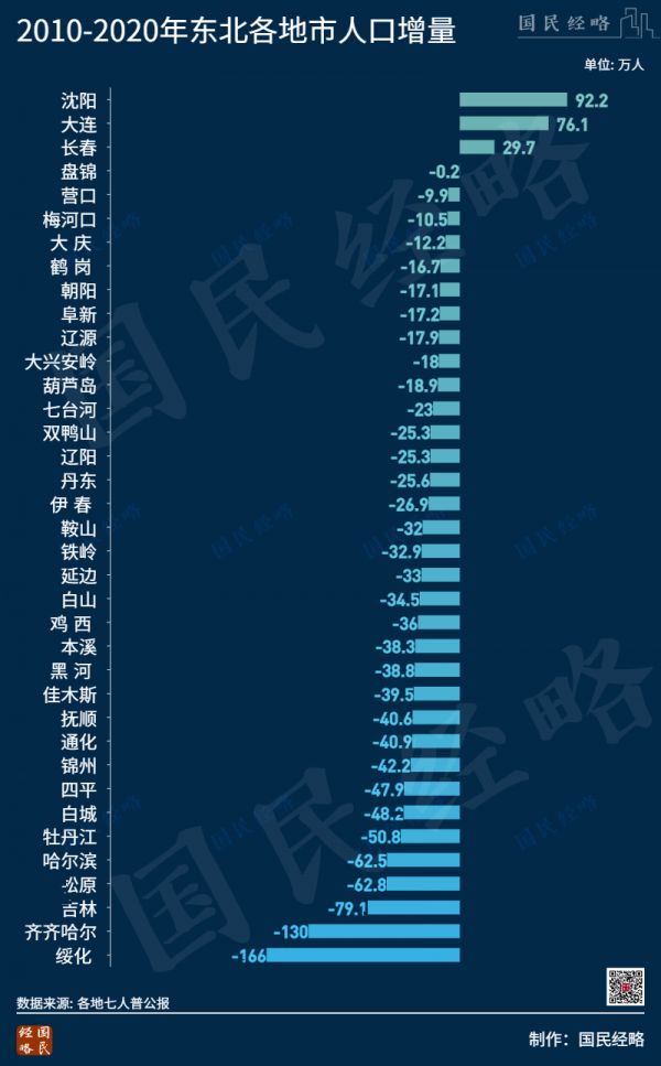 根据更为权威的人口普查数据,2010~2020年,沈阳常住人口增长92.2万人,而同期整个东北人口大幅减少1000多万人。