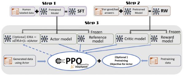 图|DeepSpeed-Chat 的具有可选功能的 RLHF 训练流程图(来源:GitHub)
