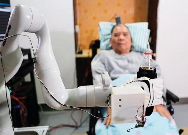 图 | 浙江大学脑机接口实验:患者通过意念控制机械臂抓住可乐瓶