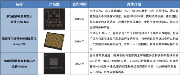 具体来看,神经接口领域包含神经刺激技术和神经记录技术两大类,自2019年发布首款产品元神TENS-NS4以来,暖芯迦已经相继推出多功能神经刺激芯片、可编程高密度神经刺激芯片、可编程通用刺激芯片等多个系列产品: