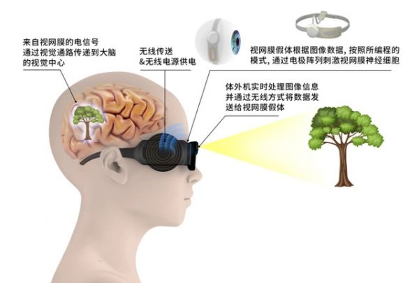 届时,体外佩戴装置在把实时图像信号通过无线传输至已经植入眼球内部的高密度刺激芯片,通过神经编解码将图像信息转化为电刺激信号,通过电极阵列刺激视网膜上的神经元,最后经视神经通路传至大脑皮层来重现图像,从而帮助盲人或中心视力缺失患者恢复功能性视力。