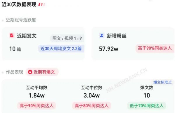 董洁近期的涨粉势头仍在持续。据新红数据显示,近30天内,董洁小红书涨粉57.92万,周均发文2.3篇,累计粉丝量近208万。