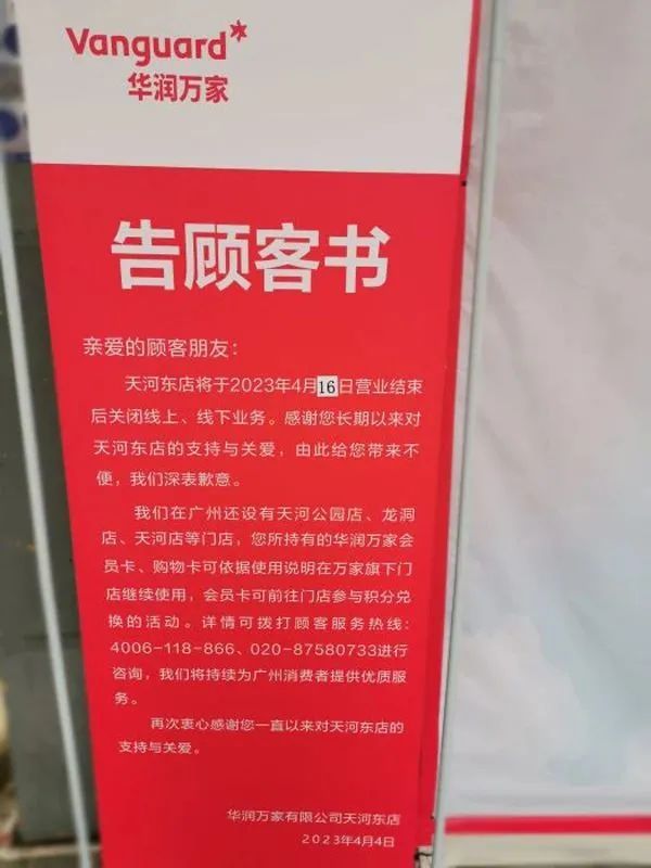近日,华润万家广州天河东店发布《告顾客书》显示,天河东店将于2023年4月16日营业结束后关闭线上、线下业务。
