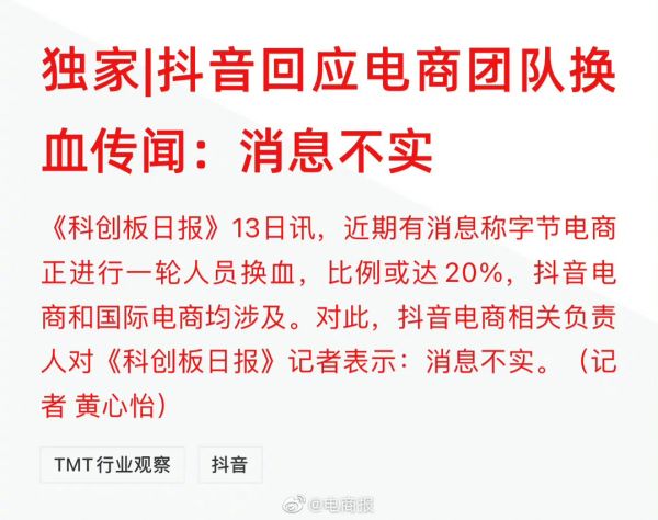 #抖音回应电商团队换血传闻# 字节电商团队大换血,比例或达20%?抖音电商相关负责人回应:消息不实。(科创板日报)
