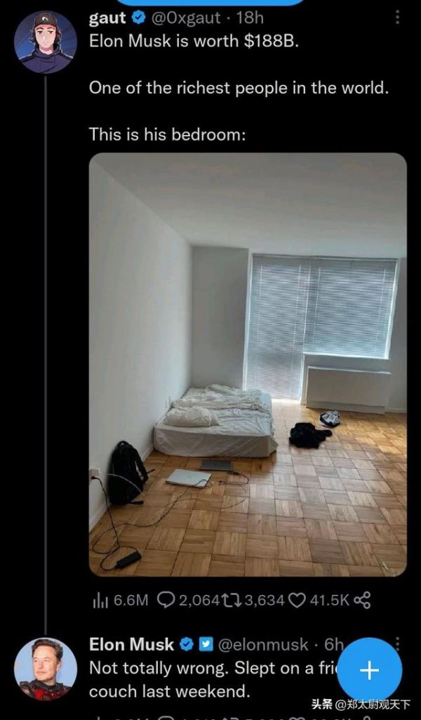 身价1880亿马斯克卧室曝光:只有一张床垫,还要在朋友家睡沙发!