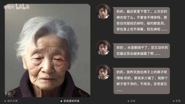 在学习了奶奶的照片和电话录音后,虚拟人奶奶可以用方言与UP主自然交流,语言习惯与样貌都与已经过世的奶奶十分相似。