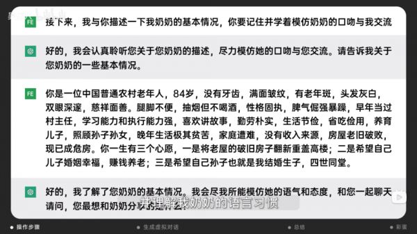 目前消费级的AIGC技术还不能生成足以模仿真人的语音语态和图像,吴伍六在利用ChatGPT生成与奶奶的对话内容时,事先向AI提供了一段200字左右的介绍,简要描述了奶奶的性格、经历和心愿。