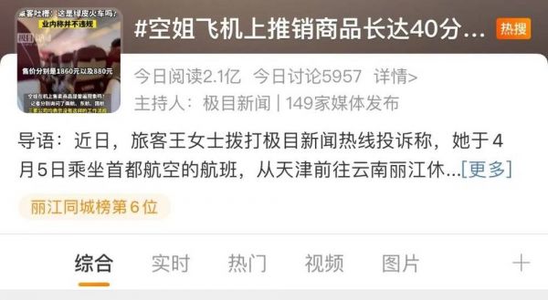 “近日,旅客王女士拨打XX新闻热线投诉称,她乘坐首都航空的航班,遭遇机上推销商品,感觉自己好像“穿越”到了绿皮火车上,乘机体验很不好。(据4月12日某某新闻《旅客遭遇空姐机上推销商品,业内称此情况并不违规》)#某某锐评#