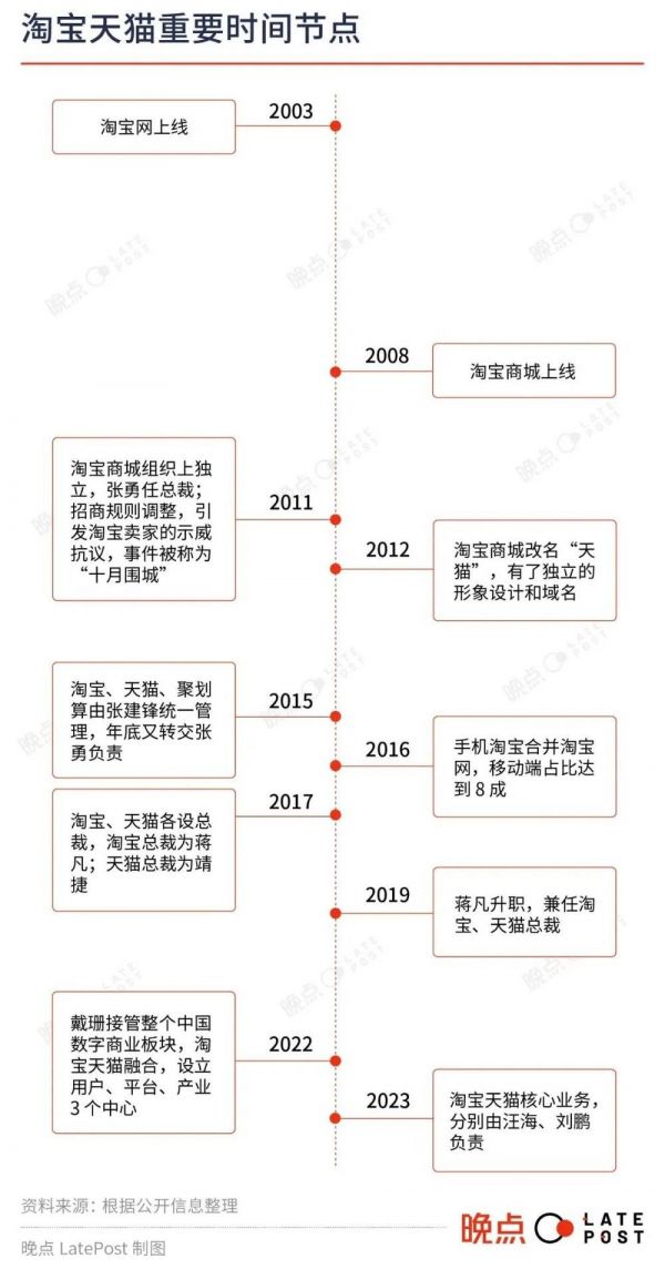 天猫(最早名为淘宝商城)原本是淘宝的子集,聚拢了一批品质和服务更好的商家。2009 年,时任淘宝网 CFO、COO 兼淘宝商城总经理的张勇将淘宝上的商家拆分为品牌商家和个体卖家,分别入驻淘宝商城和淘宝。