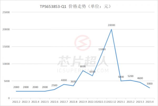 TPS653853-Q1官方价18元,市场常态价20多元,从下图可以看到,这颗芯片起势相当猛,在去年年初就直接涨到2000元,较常态价有近百倍的涨幅。到11月~12月期间,报价疯涨至2万元高点,而1万元成交价就是这段时间内发生的。今年开年,价格直接腰斩,一路下跌,最近成交价已经跌至3000元,只能说价格不再离谱,但还是贵。