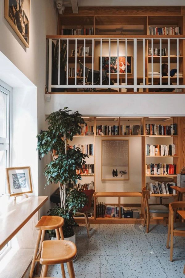 木质书架上摆放了不少外文书,可以随意取下来翻阅。墙上的海报、装饰画,也文艺范儿十足。