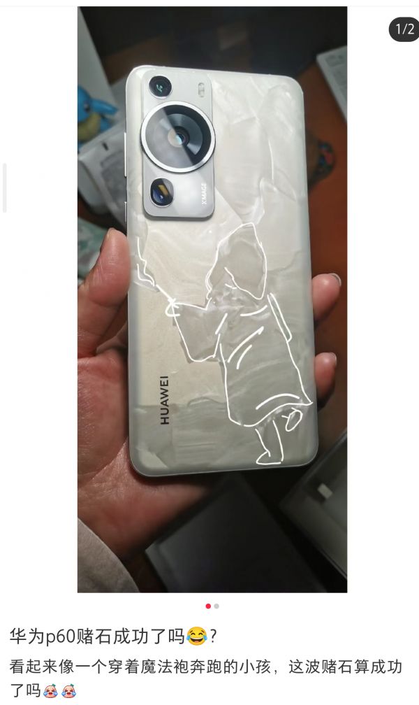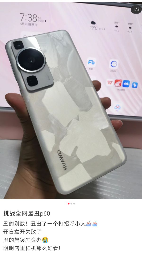 (图片来源:华为官方商城)只是让小雷没有想到的是,正是因为洛可可白独一无二的纹理,让不少拿到华为P60洛可可白新机的用户开始在社交平台上分享自己的“成果”,甚至有部分网友把新机开箱形容成开盲盒。在用户拆开包装之前,用户不知道它背面的纹路究竟是什么样,如果后盖花纹非常漂亮,就叫“赚到”。