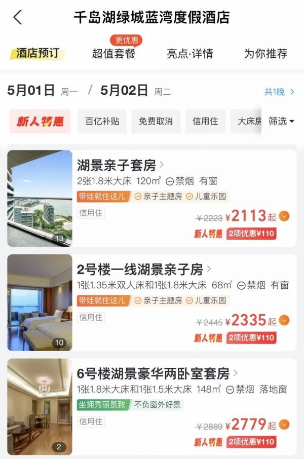 4月中旬千岛湖酒店工作日的价位在500~600元左右,周末一般会涨到1000元,但时下五一期间的普遍价位,已经到了2000~3000元一晚。