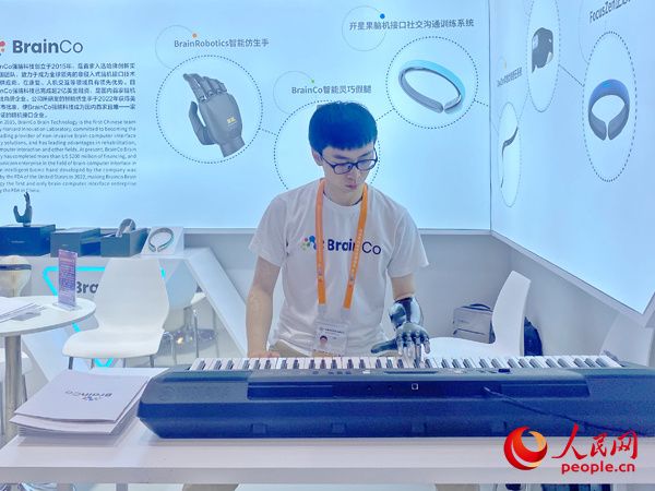 古月戴着智能仿生手在消博会现场演奏乐曲。人民网记者 张力洋摄“戴上它后,我感觉到我的手又回来了,因为它是有生命的,不是一个没有生命的机械臂。”作为这家公司的首席体验官,古月告诉记者,这款智能仿生手是一款融合脑机接口技术与人工智能算法的高科技康复辅具,通过采集、处理人体肌肉运动产生的神经电、肌电信号来实现仿生手的动作控制,该仿生手可按大脑指令,随意做出任何动作,精准控制仿生手的每根手指。