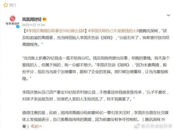 至于他说拿10亿做农村慈善项目,以及不将财富传承给儿子的言论,表面上像都市大Boss不走寻常路的爽文范本,但仍不排除利用舆论造势来给俞渝施压,继而达成离婚和股权平分目的可能。