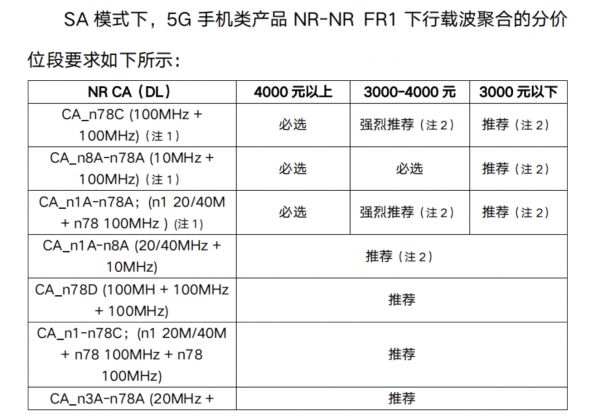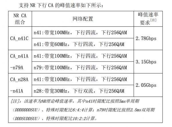 3000元及以上产品必选支持下行 NR CA,带宽组合必选支持CA_n41A-n28A;4000元及以上 产品带宽组合必选支持CA_n41A-n28A、CA_n41C、CA_n41An79A。