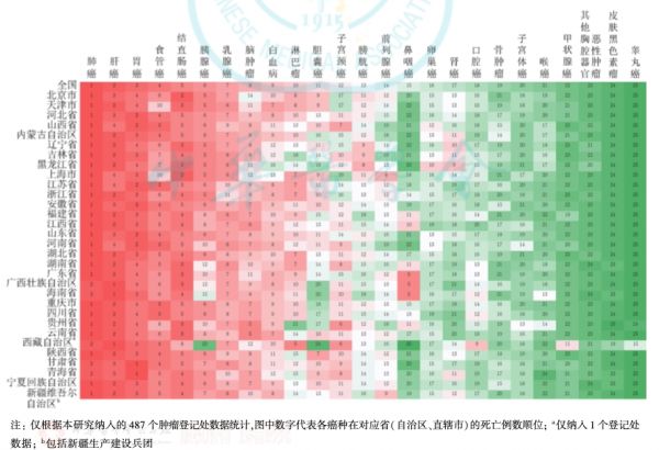 2016 年中国 31 个省(自治区、直辖市)主要恶性肿瘤死亡例数顺位,肺癌几乎是所有省市都是最高的。