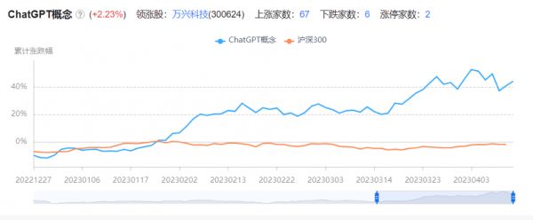 据同花顺数据,ChatGPT概念股大体呈现走高形式,从3月15日到4月3日收盘,区间累计涨幅达超30%,之后开始低走,到了12日,涨幅收至24%。