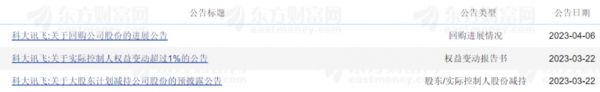 翻看最近科大讯飞发布的公告,最新三条分别是是4月6日发布的回购进展公告、3月22日发布的减持计划公告以及实控人权益变动超1%的公告。