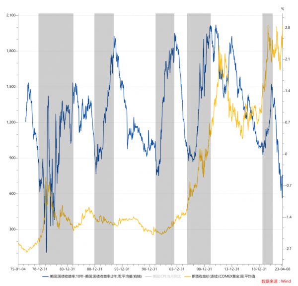 1990年代对于黄金来说非常特殊,因为这是过去50年里面,唯一一次期限利差倒挂回正的时间段里面,美债曲线牛陡的时间段里面,黄金走了一个大熊市的例子。