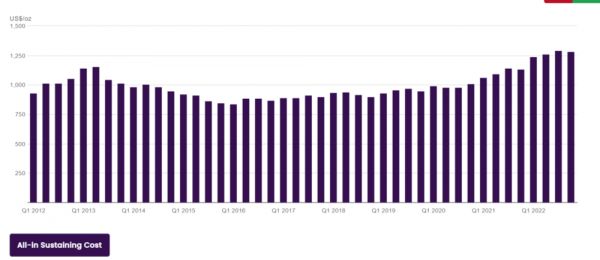 虽然我自己并不是很喜欢用黄金的供需去解释黄金,但当黄金丧失自己金融属性的时候,它的确也有商品的特征。比方说黄金的低点有时候也可以用AISC去框画。在过去20年的历史上,黄金极少跌到自己成本线附近。