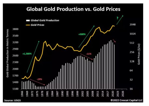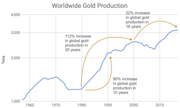 1980~1990年是黄金最牛的丰产10年,之前聊过这个问题,1970年代的大通胀,鼓励了一群人投身矿业领域(我估计未来十年这行业人也会很多),所以产量激增。