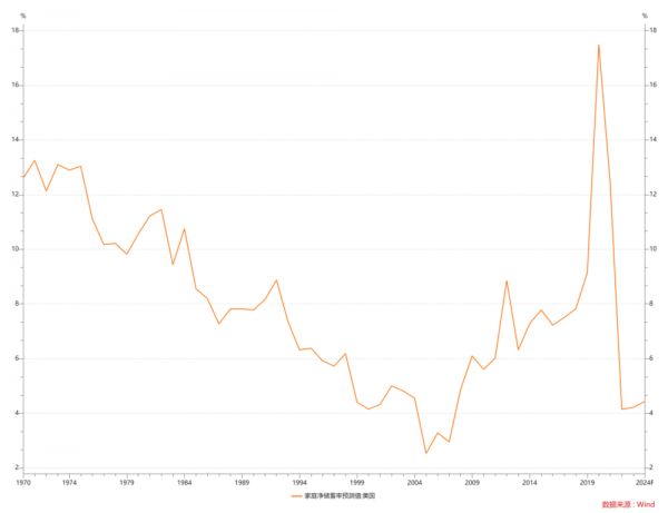 经过高通胀的侵蚀,美国储蓄率已经在很低的位置。要继续走低的空间并不大。