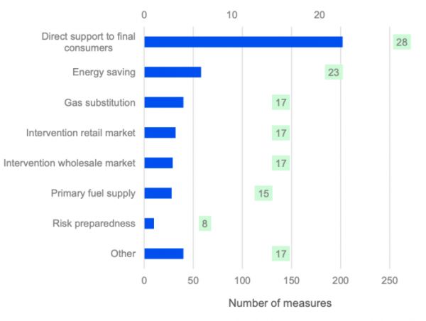 从措施的实施方式来看,直接支持消费者是最广泛采用的方式,约占46%,其次是节能鼓励,约占总措施的13%。在直接支持消费者的措施中,超过60%的措施是通过收入补贴的形式发放(例如一次性现金支付),而其余的则多以能源账单折扣的形式实施(价格支持)。
