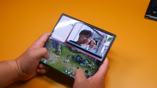 「折叠屏手机的大屏,带来了更舒适的体验,比如说可以多屏操作,一款应用可以在两个屏幕上呈现,一块屏幕微信聊天、另一块屏幕看公众号。也可以在大屏幕上分屏运行不同的应用,比如微信和视频 App 各占一半。普通智能手机也有分屏功能,但受限于显示面积用起来很局促。」