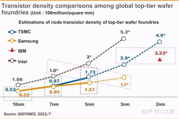 上文提到,在进入FinFET后,14nm、10nm等数字已经不能代表工艺制程,晶体管密度才能更直观的展示技术先进程度。彼时三星、台积电同为5nm工艺,但两家代工厂的晶体管密度仍有所不同。台积电5nm工艺为1.73亿颗晶体管/平方毫米,而三星的工艺仅达到1.27亿,低了近27%。工艺落后成为三星代工的骁龙变“火龙”的直接原因。