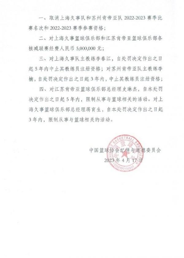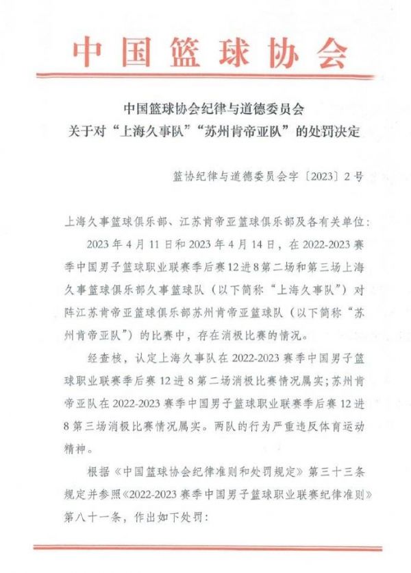 4月17日,中国篮球协会纪律与道德委员会发布公告,4月11日和4月14日,在2022~2023赛季中国男子篮球职业联赛季后赛12进8第二场和第三场上海久事篮球俱乐部久事篮球队对阵江苏肯帝亚篮球俱乐部苏州肯帝亚篮球队的比赛中,存在消极比赛的情况。