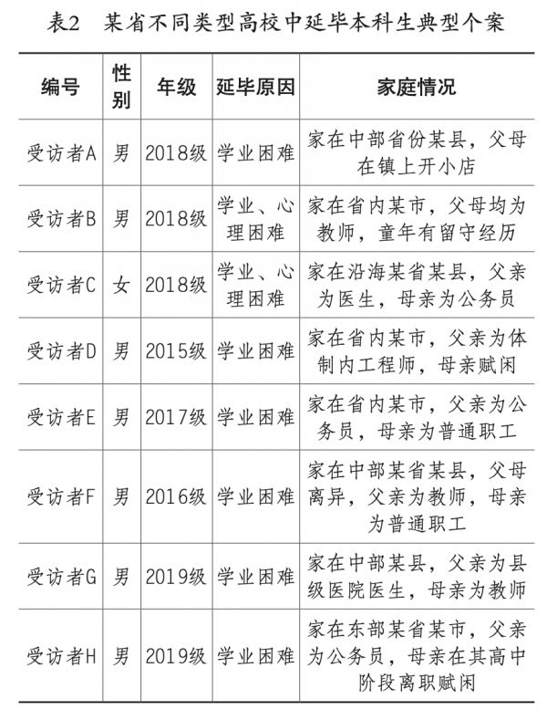 本研究从上述四所高校中选取延毕本科生的案例,选择遵循目的性抽样原则,在较多案例中选择了典型个案8人(见表2),对这些个案进行半结构化访谈,访谈全部以面对面形式为主,部分还通过电话或微信语音访谈作为补充。本研究旨在“探索”和“解释”延毕生现象“是什么”“为什么”“怎么样”,即描述延毕本科生的状况、阐释延毕的生成机理、探究如何预防。