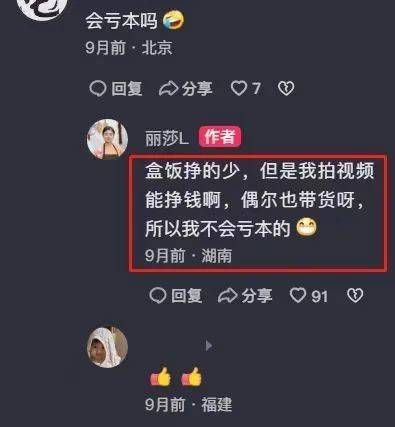 更何况,这些视频博主还有另外的收入来源,那就是靠视频广告带货赚钱。另一名盒饭博主@丽莎,就在评论区回复过网友关于亏本的问题,流量带来的收入才是大头。
