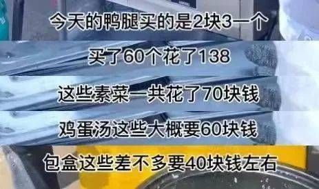 鸭腿2.3元一个,买了60个花了138元,一系列用到的蔬菜花了70元,米饭馒头鸡蛋汤等大概60元,算上一次性筷子包装,煤气等差不多40元,花费共计308元。