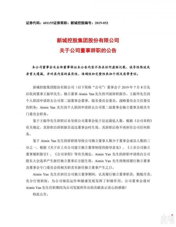 @每日经济新闻【王振华辞去新城控股所有职务】7月8日晚,新城控股发布公告称,7月8日先后收到董事王振华先生、独立董事Aimin Yan先生的书面辞职报告。王振华先生因个人原因申请辞去公司第二届董事会董事、提名委员会委员、战略委员会主任委员的职务;Aimin Yan先生因个人原因申请辞去公司第二届董事会独立董事及相关专门委员会职务。
