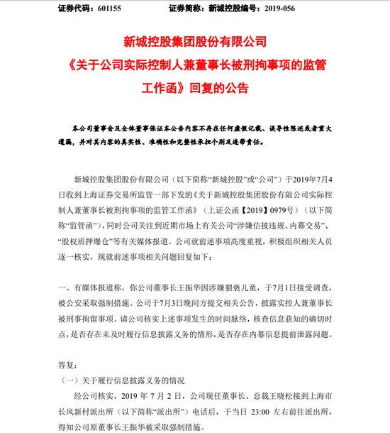 新城控股:董事长王振华被刑拘,其子王晓松接任