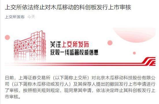 @中国证券报【科创板出现首家终止发行上市审核的公司】7月8日晚间,上交所官网披露,对北京木瓜移动科技股份有限公司(简称“木瓜移动”或发行人)及其保荐人提出的撤回发行上市申请进行了审核,按照相关规则规定,现同意其申请,依法决定终止其科创板发行上市审核。
