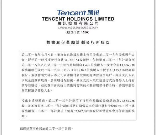 @新浪科技【腾讯控股:7月8日授出218.89万份购股权,每股351港元】7月8日晚间消息,腾讯控股在港交所公告称,根据2017年购股权计划,公司于7月8日授出合共218.89万份购股权以认购股份,每股351港元,惟须待承授人接纳方可作实,有效期为七年。