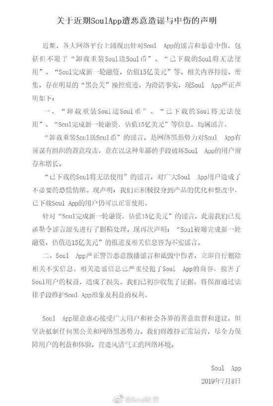 Soul App表示,严正警告恶意散播谣言和诋毁中伤者,立即自行删除相关不实信息;已初步收集证据,将保留通过法律手段维护Soul App形象及利益的权利。