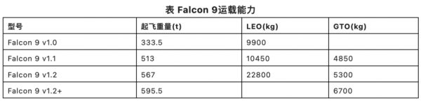 Falcon 9运载能力见上表,v1.2版起飞重量567t,LEO能力达到22.8t,运载效率达到0.04,为世界之最。也就是同样的运载能力,Falcon 9起飞规模更小,也就更便宜。