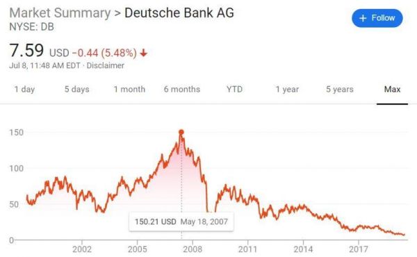 截至北京7月9日零时,德银股价暂报7.59美元,盘中跌幅5.48%,这与德银曾经超过150美元的巅峰股价相比实在相去甚远。9.1万员工有1/5会被裁