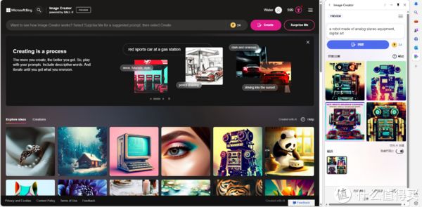 微软 image creator 会根据用户的输入,自动搜索相关的数据,进行训练和优化,最终生成满足用户需求的图像。不过目前只是支持英文,同时我们可以看到服务左上角有Powered by DALL-E模型,然后还是Preview版本。