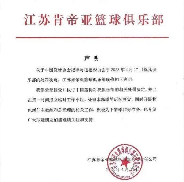 @江苏肯帝亚篮球俱乐部 微博4月17日发布声明表示,接受并执行中国篮协对该俱乐部的相关处罚决定,并已在第一时间成立临时工作小组,处理本赛季的后续事宜,同时开展物色新任主教练和总经理的相关工作,积极为下赛季做好准备。
