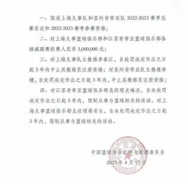 北京时间2023年4月17日,中国篮协官方发布,中国篮球协会纪律与道德委员会关于对“上海久事队”“苏州肯帝亚队”的处罚决定。