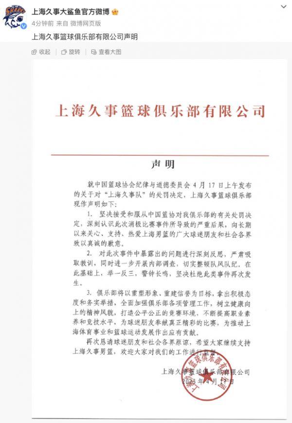 4月17日下午,针对中国篮协处罚决定,上海久事篮球俱乐部发布声明:坚决接受和服从中国篮协对我俱乐部的有关处罚决定,深刻认识此次消极比赛事件所导致的严重后果,向长期以来关心、支持、热爱上海男篮的广大球迷朋友和社会各界致以真诚的歉意。对此次事件中暴露出的问题进行深刻反思,严肃吸取教训,同时进一步开展内部调查,切实整顿队风队纪。