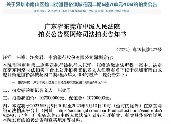 京东法拍显示,此次法拍被执行人为汪洋、汪峰,名义登记人为汪奕君,案号为(2022)粤19执恢227号。